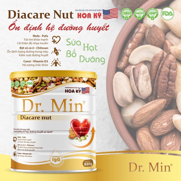 Sữa Dr. Min Diacare Nut là sản phẩm được thiết kế đặc biệt hỗ trợ cho người tiểu đường và người có nguy cơ mắc bệnh tiểu đường.